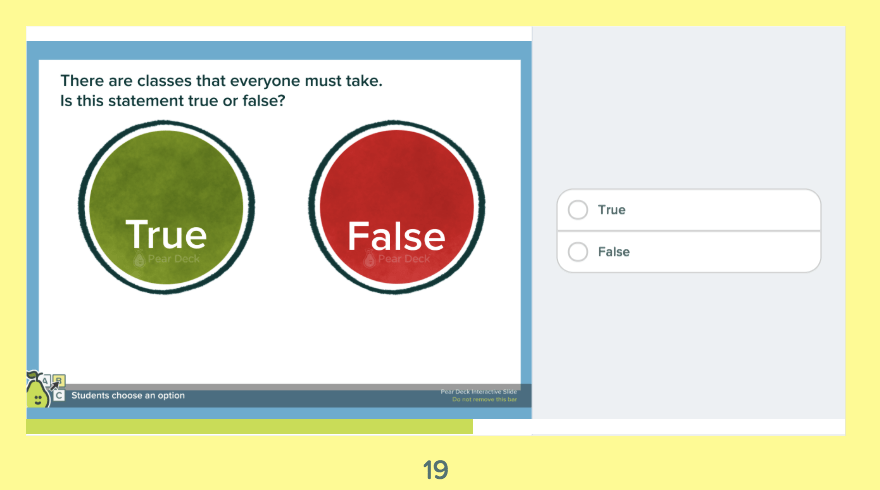 In addition to allowing students to walk with you through a presentation, it is possible to turn on the “self-paced” mode and will enable them to work through the content at their own pace. For students whose first language is not English or children who struggle reading, using PearDeck will allow the use of “text to speech” functions or even allow students to use their first language by editing the settings on their computers.