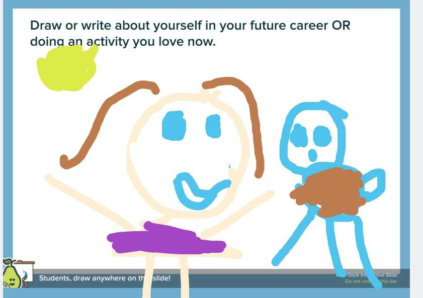PearDeck also allows students to use their creativity and draw or write to answer questions. As the instructor, you get the responses from the class right away without the cumbersome process of paper collection and grading. In the photo below, I was able to walk around the classroom and see students as they were drawing. The little girl shared that she hoped to become a veterinarian because she loves animals.