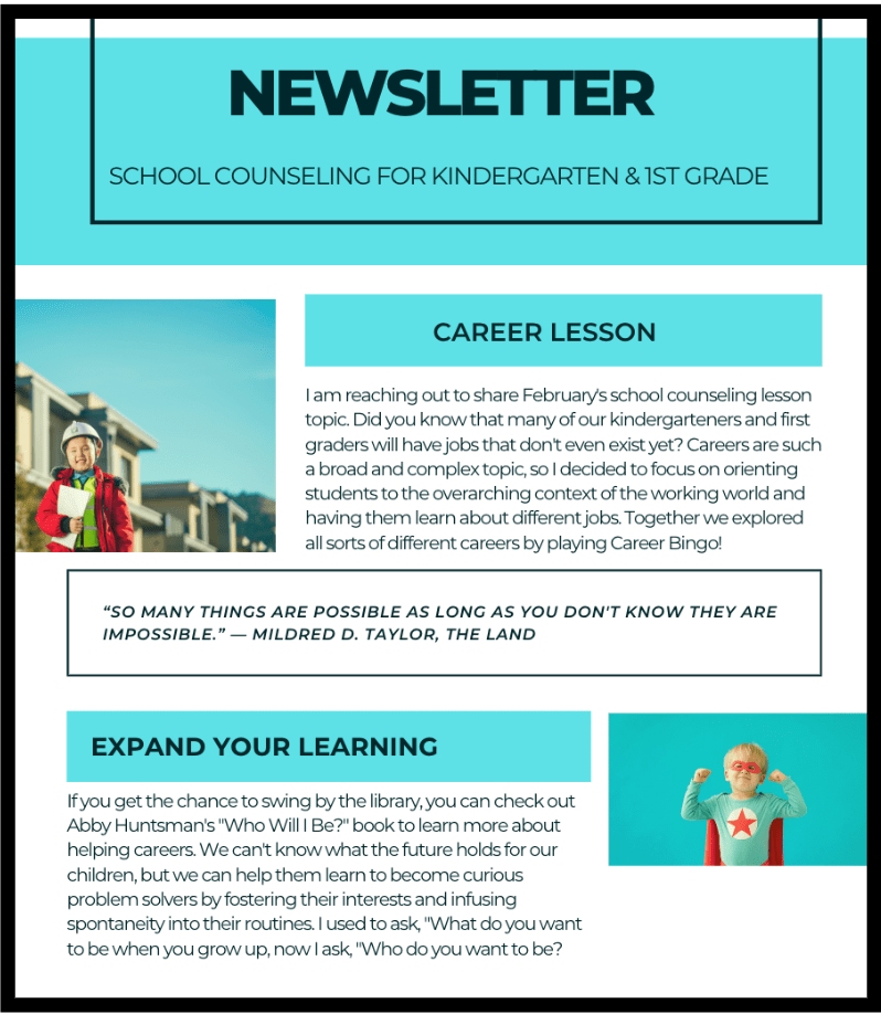 In-person and virtual college tours are ideal for older students, but the littles can enjoy these activities, too. To enrich my students’ career exploration, I enrolled them in the interactive online career awareness program ‘Paws in Jobland.’ This dynamic platform allowed my students to virtually explore Jobland, a fictional world where they could uncover their interests and investigate various careers. The program was designed to be engaging and informative, and I was pleasantly surprised when a fifth grader shared his career aspirations with me, inspired by the career game he had played in third grade. Such interactive tours can make career exploration more accessible and ignite students’ curiosity and ambition, making it a valuable resource for any school counselor.
