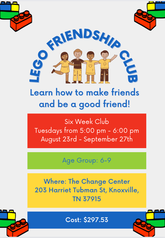 Over the course of six weeks, children will learn skills to communicate, listen, follow directions, and interact with other children through the use of games and Legos. The Lego Friendship Club helps children feel more confident and learn the skills they need to be good friends. Sign up now and help your child make new friends! Location: The Change Center 203 Harriet Tubman St, Knoxville, TN 37915 Date | Time: 5:00 pm – 6: 00 pm EST August 23, 2022 — September 27, 2022